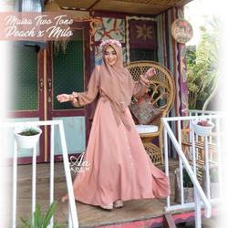 Ide model gamis lebaran terbaru yang sangat unik tampak seperti berpotongan tepat di bagian pinggul.